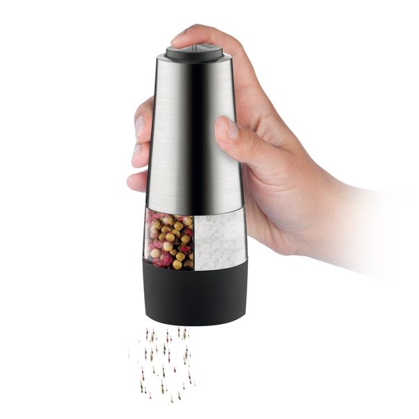 Mlýnek uvedete do provozu pouhým stisknutím tlačítka pro sůl nebo pepř – k solení či pepření vám tak stačí jedna ruka. Má praktické víčko pro zachytávání zbytků koření, které slouží i jako násypka pro snadné plnění. Kvalitní keramický mechanismus zajišťuje dlouhou životnost mlýnku.Elektrický mlýnek je opatřen dvěma keramickými mlecími mechanismy, dvěma oddělenými zásobníky na koření a dvěma tlačítky spouštění mletí pro pepř a pro sůl.