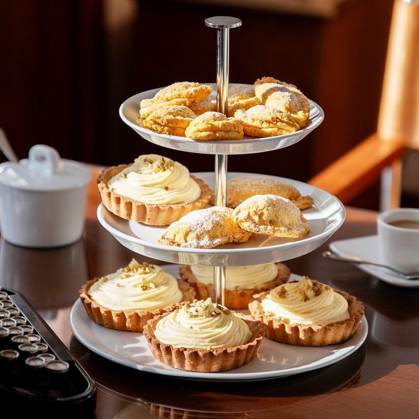 Praktická etažérka ze sněhobílého porcelánu přináší elegantní řešení, jak servírovat drobné sladké a slané pochutiny a současně ušetřit místo na stole.