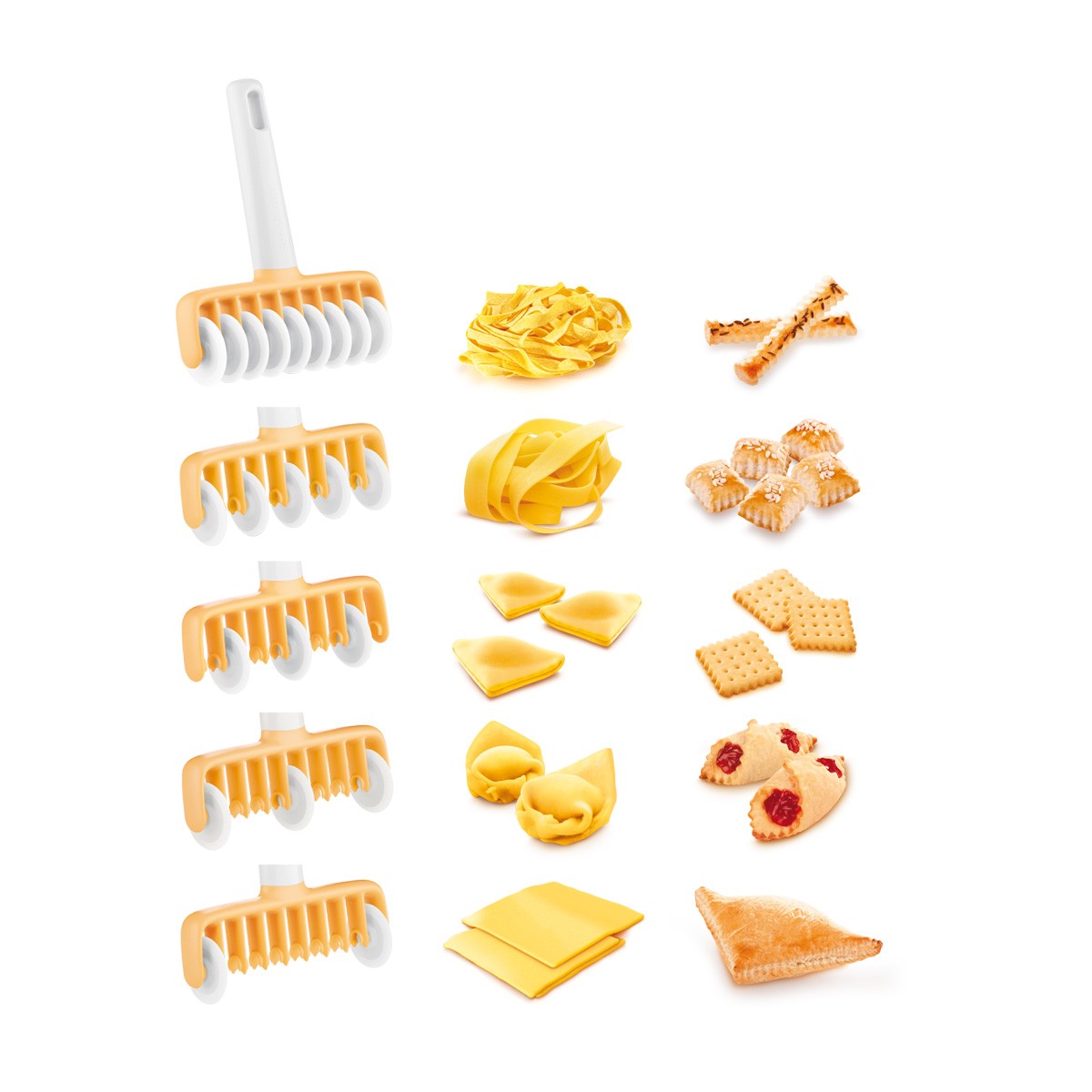 Vynikající pro přípravu tradičních italských těstovin typu fettucine, tagliatelle, pappardelle a lasagne i plněných těstovin typu tortellini, ravioli apod. Ideální i pro přípravu tyčinek, sušenek, plněných taštiček, pirohů atd. Vykrajovací kolečka jsou odnímatelná, šířku krájeného těsta lze snadno nastavit, dodáváno s 9 rovnými a 9 zvlněnými kolečky. Vyrobeno z prvotřídního odolného plastu, vhodné do myčky. Návod k použití uvnitř balení. 3 roky záruka.