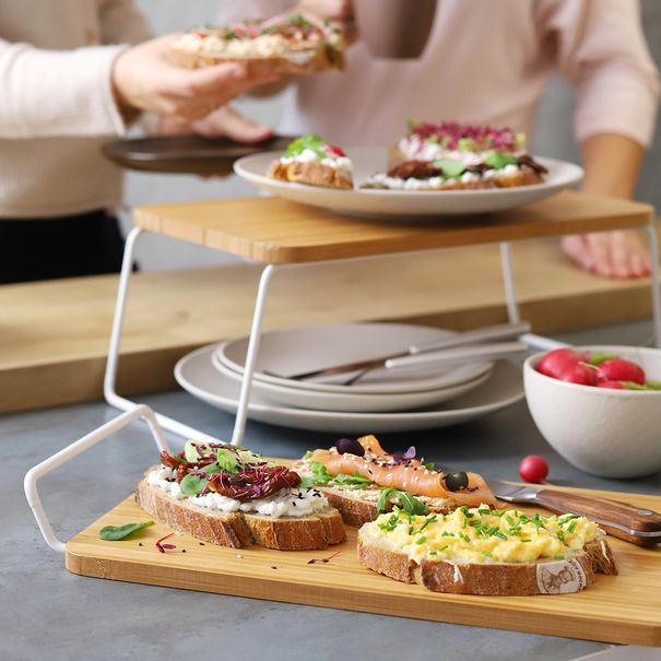 V obrácené pozici, tedy s opěrkami směřujícími vzhůru, slouží jako elegantní servírovací deska s prostornými úchyty ideální pro stylové podávání pokrmů.