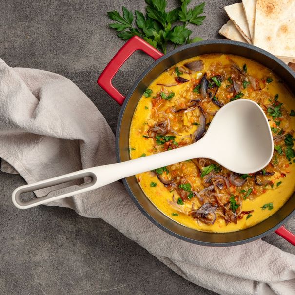 Pracovní část naběračky SILICON PRIME je vyrobena ze žáruvzdorného silikonu odolného do 220 °C. Nářadí je kvalitní a odolné, přitom zároveň mimořádně šetrné vůči povrchu nádobí.Je vhodné k použití ve všech typech nádobí. Ideálně se hodí zejména do nádobí s antiadhezním nebo keramickým povlakem, jehož povrch nepoškodí.Pracovní části se zaoblenými hranami usnadňují manipulaci s pokrmy v rozích nádobí. Podélné otvory v rukojetích snižují hmotnost nářadí, přispívají ke komfortní a bezpečné manipulaci a umožňují jeho zavěšení na háček.