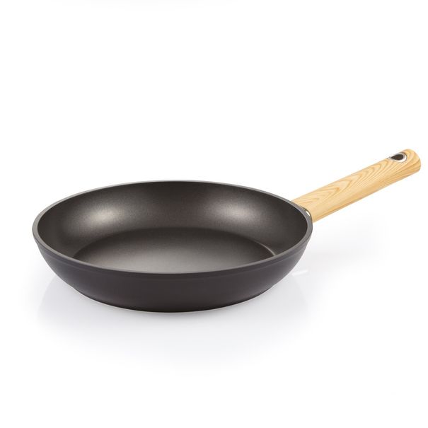 Kvalitní pánev o průměru 28 cm ve skandinávském stylu s komfortní rukojetí imitující přírodní dřevo