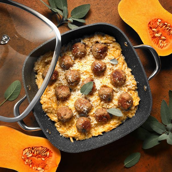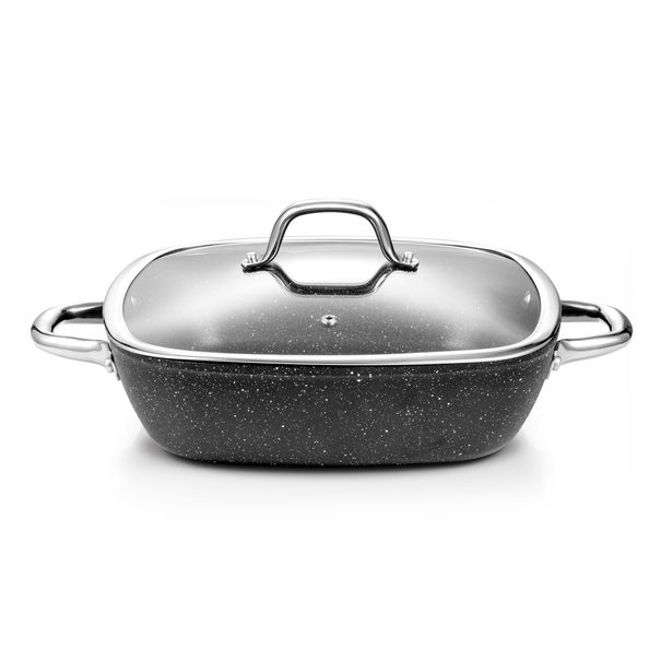 Hluboká pánev s povrchem připomínajícím přírodní kámen neobsahuje žádné plastové části, je proto vynikající pro každodenní používání na všech typech sporáků i v pečicích troubách. V pečicí troubě je žáruvzdorná až do teploty 230 ˚C, s nasazenou poklicí do 200 ˚C.