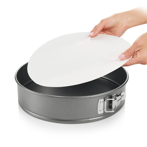 Tři dodávané velikosti pečicího papíru pokrývají všechny běžně používané průměry kulatých dortových a pečicích forem s průměry od 18 do 28 cm.