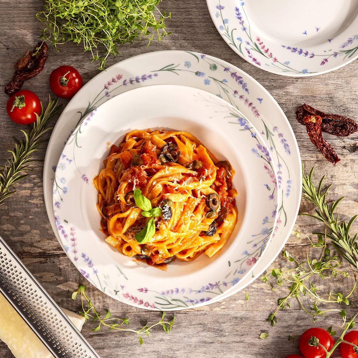 Elegantní jídelní talíře PROVENCE jsou vyrobeny z přírodního porcelánu a upoutají pozornost atraktivním dekorem s motivem, inspirovaným nekonečnými levandulovými záhony jižní Francie. Originální dekor s drobnými akvarelovými kvítky v různých kompozicích vznikl v Design centru TESCOMA.