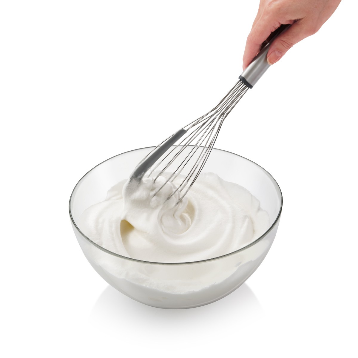 Přímo na nerezovém šlehacím košíku má metla umístěnu silikonovou stírací manžetu, která nahrazuje běžnou kuchyňskou stěrku. Silikonová stěrka je navržena tak, aby při šlehání nepřekážela. Zároveň umožňuje pohodlně a rychle setřít krém nebo těsto ze stěny mísy kdykoliv během šlehání.