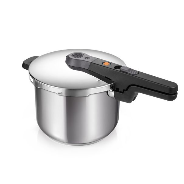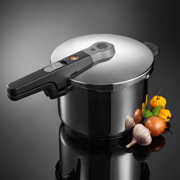 Moderní 6litrový tlakový hrnec s vyjímatelným pracovním ventilem a bezpečným vypouštěním páry.